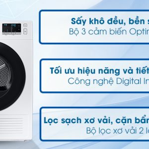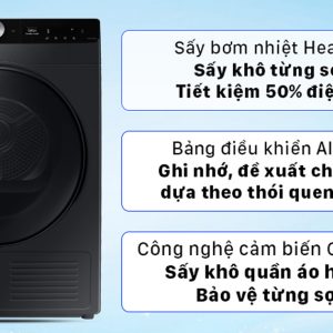 – Với khối lượng sấy 9 kg, máy phù hợp cho gia đình từ 3 đến 5 người, đáp ứng tốt nhu cầu sấy quần áo hàng ngày, đặc biệt vào mùa mưa hoặc khi cần sấy nhanh.
