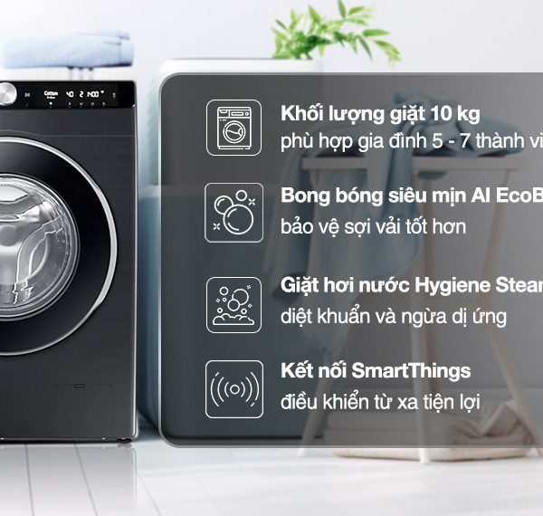 - Máy giặt cửa trước có khối lượng giặt 10 kg phù hợp gia đình 5 – 7 thành viên.