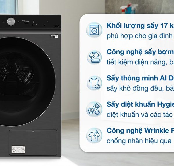 – Khối lượng sấy tối đa: 17 kg đáp ứng nhu cầu sấy đồ trong gia đình có trên 7 thành viên hoặc gia đình ít người hơn nhưng có nhu cầu giặt sấy cao, thường xuyên dồn đồ cả tuần để làm khô trong 1 lần thì chiếc máy sấy này là lựa chọn hoàn hảo cho bạn.